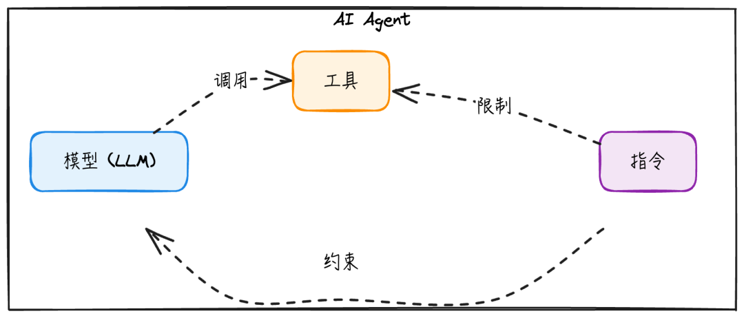 AI Agent 构成三者构成了 AI Agent 的下限和上限,模型越强,对于指令和工具的调度能力更准确,但是从工程学的角度来考虑,较弱的模型通过对工具和指令的结合,一样能制造功能强大的 Agent。