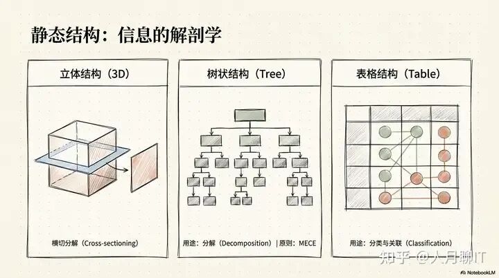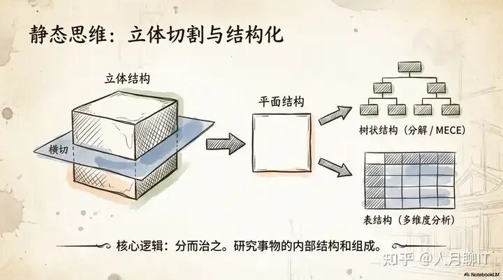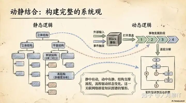 体系思维由两大核心基石构成:静态结构负责组织信息,动态结构负责理解运作。