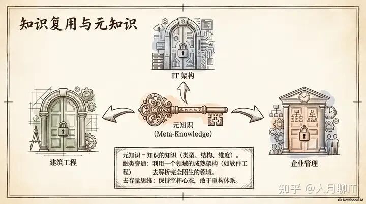 • 如何应用? 掌握了元知识,我们就能实现“触类旁通”。例如,我们可以利用一个成熟领域的架构(如软件工程)去解析一个完全陌生的领域(如建筑工程或企业管理),因为它们底层的组织、流程和管理逻辑可能存在共通的模式。要做到这一点,关键在于“去存量思维”,时刻保持“空杯心态”,敢于用已有的框架去重构新的体系。