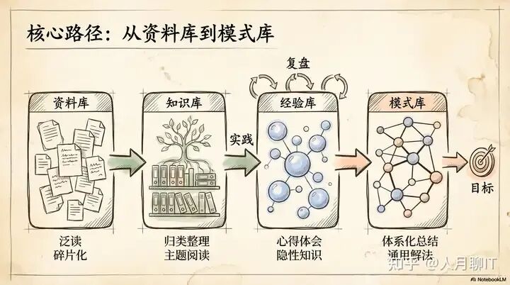 拥有了详尽的蓝图,架构师的工作便进入了最关键的阶段:将图纸变为现实。这个过程,就是将外部知识内化为内在能力的演进之路,它需要经历从“资料库”到“模式库”的四级跃迁。