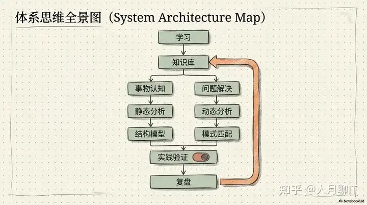现在,让我们通过一张“体系思维全景图”来回顾整个流程:我们从“学习”开始,不断丰富我们的知识库(如知识供应链所述)。在面对具体任务时,我们通过“事物认知”调用静态结构进行分析,通过“问题解决”运用动态结构进行模式匹配。这两大过程均由归纳与演绎的逻辑引擎驱动。随后,我们将方案付诸“实践验证”,并通过“复盘”将新的洞见反馈回“知识库”,形成一个完整的、不断强化的正向循环。