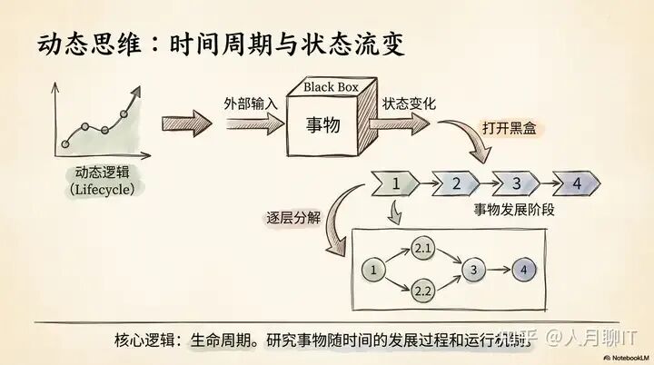 动态思维则好比建筑的功能流程图,它关注事物随时间的发展过程和运行机制,其核心逻辑是“生命周期”。它将事物看作一个系统,研究其从开始到结束的演变过程: