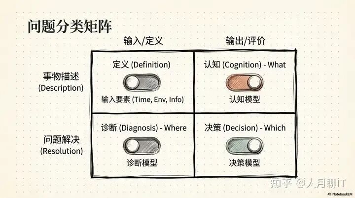 为了更高效地匹配,我们还可以使用“问题分类矩阵”进行预判。该矩阵基于两个维度定义问题:横轴是“输入/定义 (Input/Definition)”与“输出/评价 (Output/Evaluation)”,纵轴是“事物描述 (Description)”与“问题解决 (Resolution)”。这四个象限分别对应: