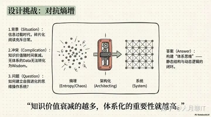 我们正处在一个信息过载的时代,碎片化的阅读充斥着我们的日常。这种背景带来了一个严峻的冲突:我们获取的知识,其价值会随时间迅速衰减,而那些未经组织的、零散的数据(Data)无法自动转化为能指导我们行动的智慧(Wisdom)。面对混乱与无序的“熵增”世界,我们不禁要问:我们如何才能建立一个能够自我进化的思维操作系统?