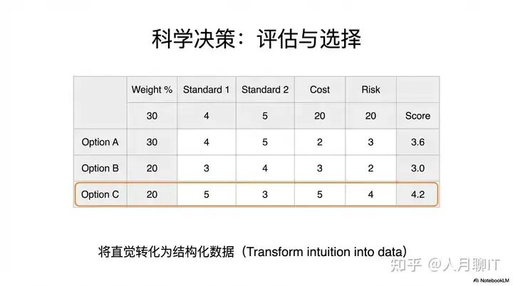 通过设定评估标准(Standard)、成本(Cost)、风险(Risk)等维度,并为每个维度分配相应的权重(Weight %),我们可以为每个选项计算出一个综合得分(Score)。在所提供的案例中,经过所有因素的加权计算后,Option C以4.2分的最高分脱颖而出,这清晰地展示了结构化方法如何揭示出仅凭直觉可能错过的最优选择。