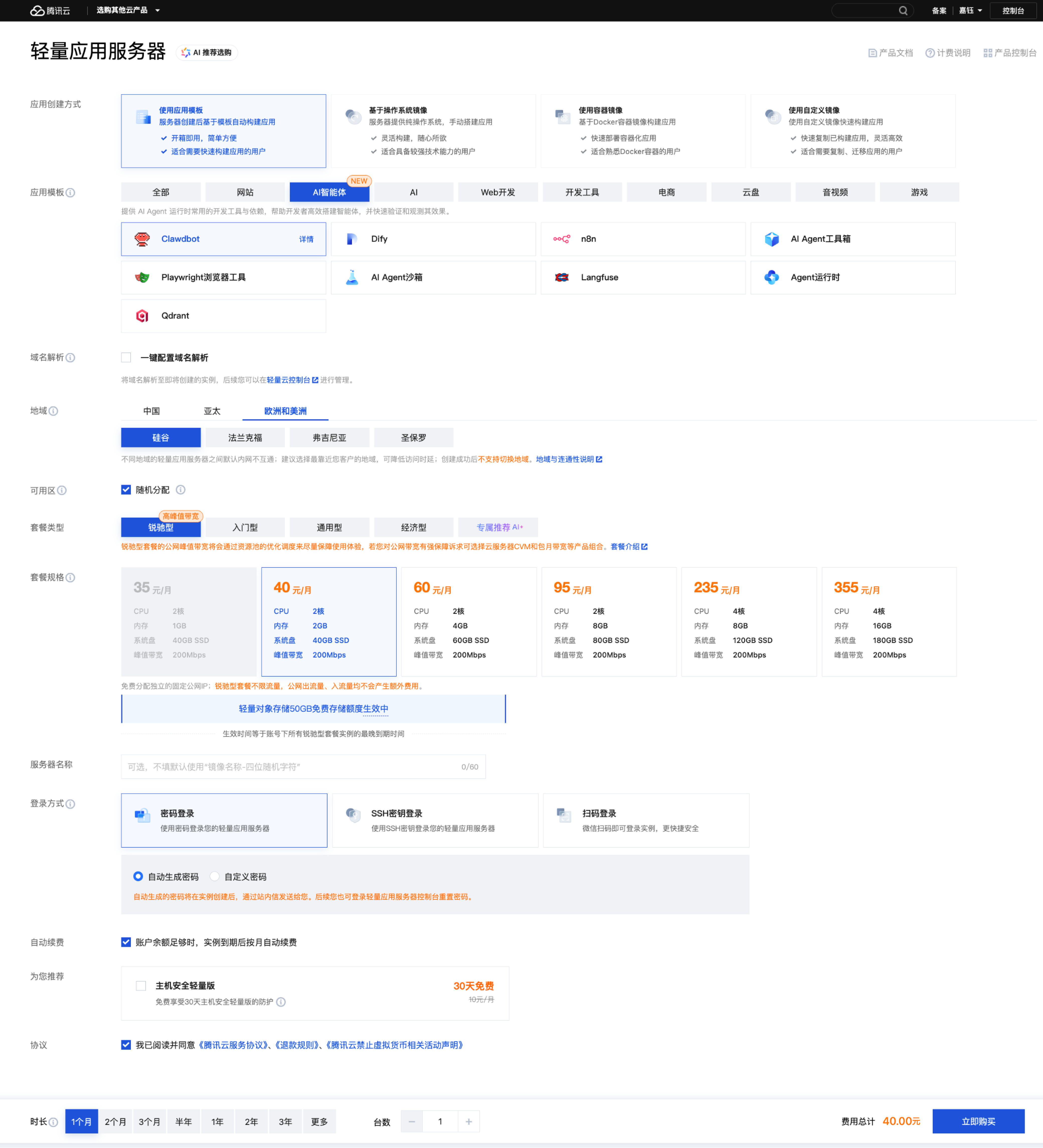 选购新实例 | 全新部署 | 1. 进入Lighthouse购买页2. 应用模板选“AI智能体 > Clawdbot”3. 地域优先选硅谷、新加坡等海外节点4. 套餐选择2核2GB或以上配置 |