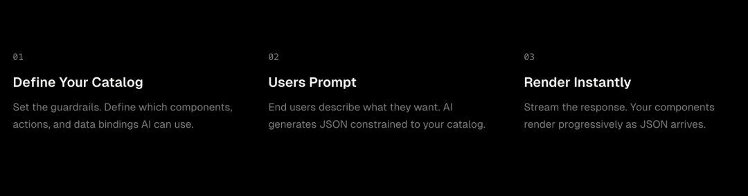 json-render ,你一看就懂,AI->JSON->RENDER->UI ,直观的了解就是 AI来生成界面,但是中间是通过让 Ai 输出 json 二不是dom 叔或者 React 或者 Vue 那么一大坨。而且这货最为突出的是。