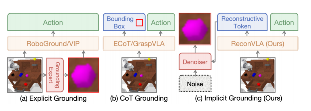 而 ReconVLA 通过重建过程,将关键区域作为一种隐式的视觉监督信号,引导模型生成所谓的“重建 token(reconstructive tokens)”,从而在不引入额外输入或输出的前提下,重塑视觉感知能力。