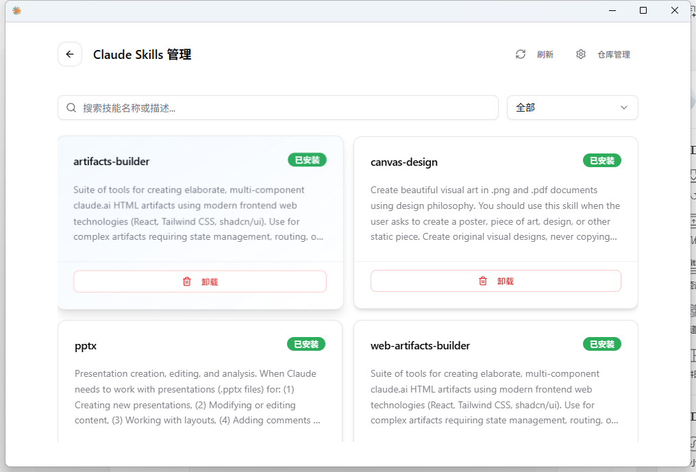 当然,目前还有一种更简单的方法,一位大佬做的管理小工具(cc swtich)直接集合了skill库,看到哪个需要,直接一键点击下载