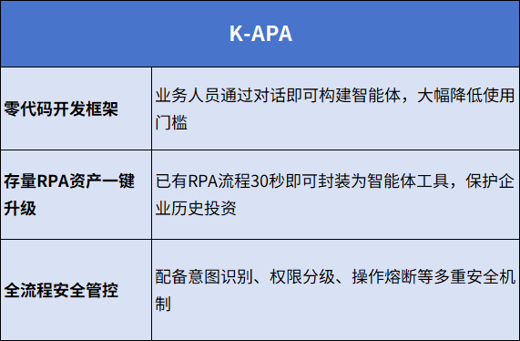 K-APA的创新在于将大模型的灵活性与RPA的稳定性深度融合:大模型负责任务规划,RPA负责精准执行,有效规避了大模型的“幻觉”风险。平台支持通过自然语言快速构建自动化流程,无需编程基础即可创建场景级AI业务助手。