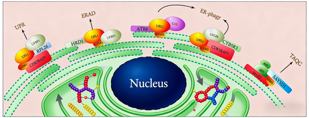 内质网是分泌蛋白和膜蛋白合成与折叠的主要场所。在这一过程中,核糖体停滞或错误翻译会产生异常多肽,威胁细胞稳态。研究发现,当与内质网结合的核糖体发生停滞时,会触发一种特异性的质量控制机制。其中,核糖体大亚基的特定蛋白RPL26会发生犹素化修饰。这种由UFL1-UFBP1复合物催化的修饰,作为关键的信号标签,指导停滞的核糖体及其所携带的异常新生多肽被靶向至溶酶体途径进行降解。这一过程被称为核糖体关联质量控制。此外,跨膜蛋白SAYSD1在此过程中扮演协调者角色,确保被犹素化标记的底物能有效转运至溶酶体。该通路的破坏会导致异常蛋白在内质网累积并引发内质网应激。这表明,犹素化是内质网监控蛋白质合成质量、清除“生产次品”的核心信号机制。