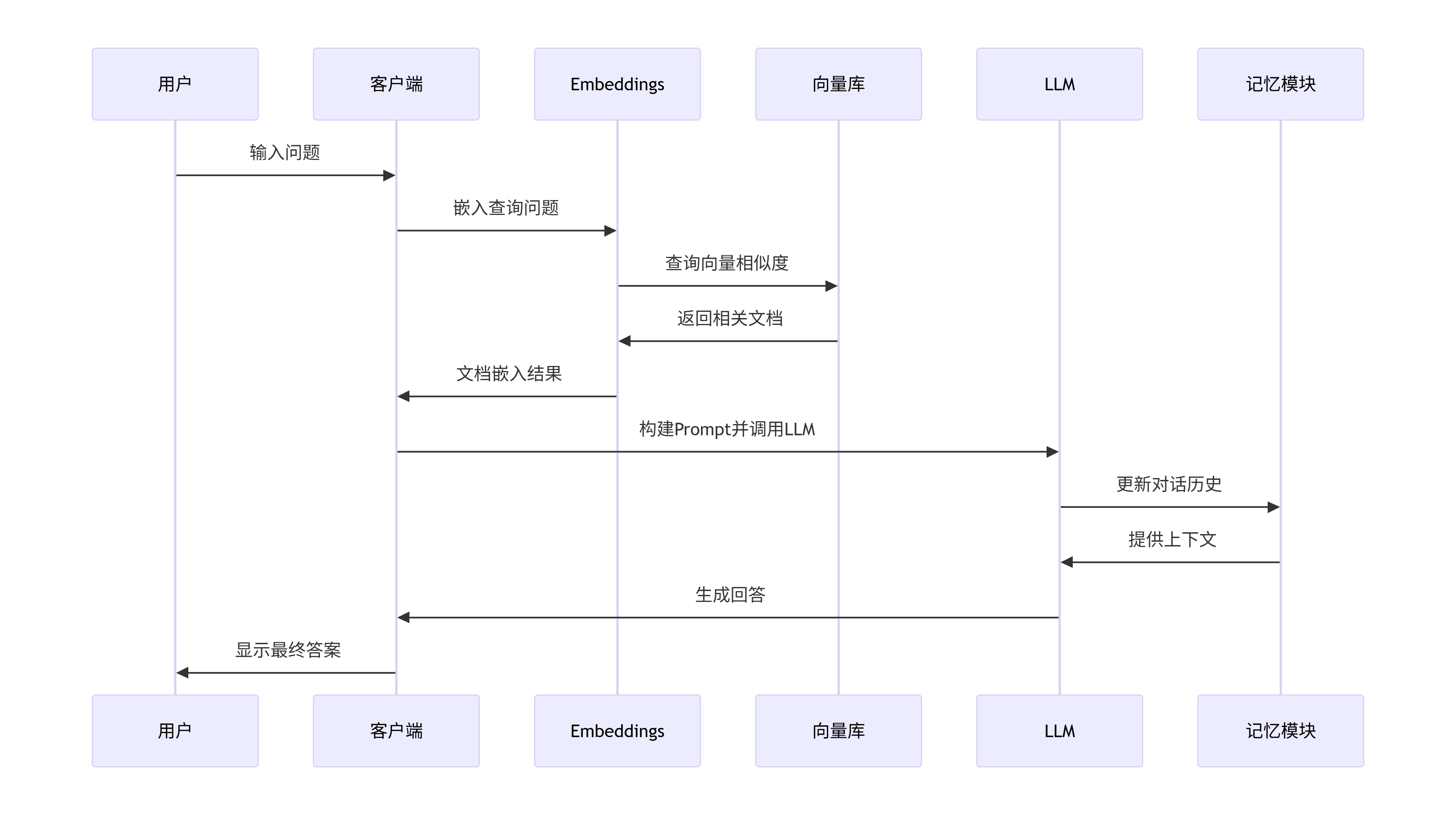 vectors = embeddings.embed_documents(documents)这个序列图描述了用户与一个基于检索增强生成(RAG)的对话系统的交互过程。这个系统包括客户端、嵌入模型(Embeddings)、向量库(Vector Store)、大语言模型(LLM)和记忆模块(Memory)。让我们一步步解释这个交互过程,并提取重点。