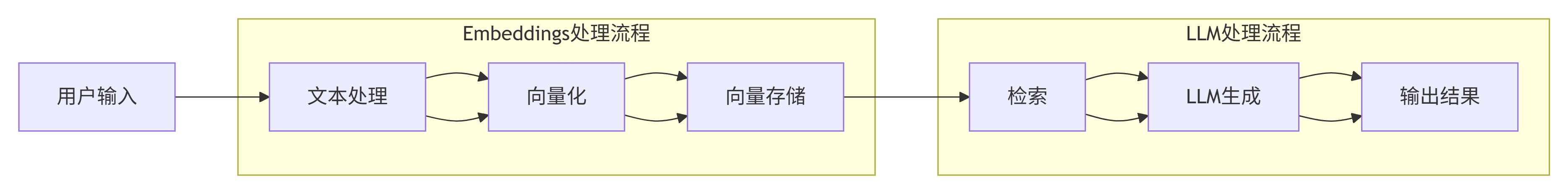这个流程图展示了从用户输入到输出结果的整个过程,其中包含两个子流程:Embeddings处理流程和LLM处理流程: