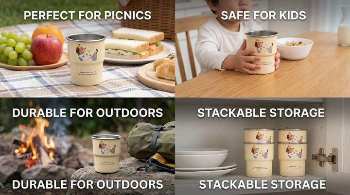 Generate an Amazon infographic grid based on the products in the reference images, showcasing multiple real-world usage scenarios for the products in the attached reference photos. Automatically identify 4-6 suitable life scenarios and corresponding benefits based on product type and appearance. Arrange small, realistic scene images in a grid or collage format, with each scene subtly overlaid with brief text describing the benefits or context. Natural lighting ensures clear product visibility in each scene, maintaining a consistent style and high detail, suitable for Amazon product detail pages.