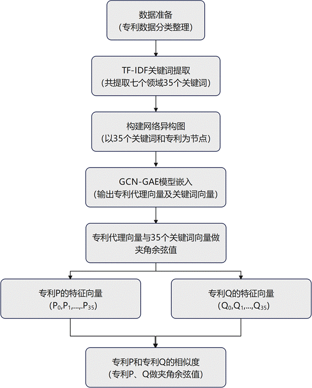 GCN-GAE是结合图卷积网络(GCN)与图自编码器(GAE)的深度学习模型,本研究采用双层GCN结构作为编码器:第一层通过ReLU激活函数捕获节点局部邻域特征,识别专利与关键词的直接技术关联;第二层通过线性传导层整合高阶拓扑信息,捕捉跨领域的技术关联;同时加入正交正则项避免特征向量的维度冗余,让模型学习到的每个维度都能体现节点的独特信息。模型训练后输出256维的专利与关键词代理向量,再将专利代理向量与35个领域关键词向量计算余弦相似度,最终得到35维的专利特征向量,该向量同时包含专利的语义信息与领域关联信息。