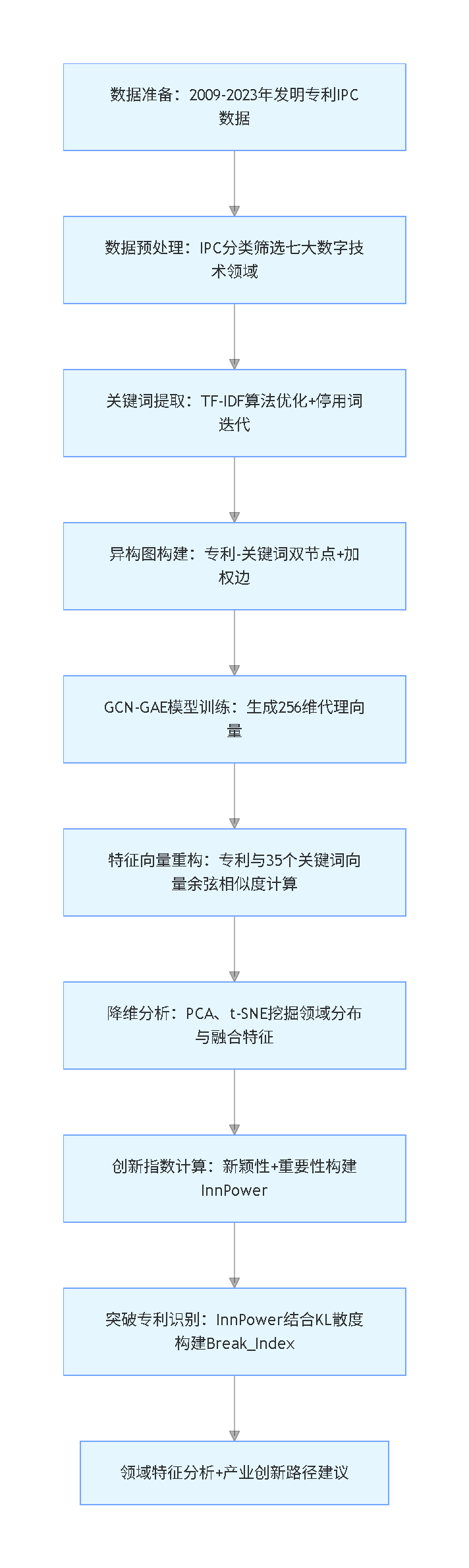 本研究基于生成的35维专利特征向量,计算专利间的余弦相似度,结合新颖性与重要性构建创新突破指数(InnPower),再通过PCA、t-SNE降维可视化挖掘领域分布特征,结合KL散度构建综合指标Break_Index筛选突破性专利,最终实现七大数字技术领域的创新特征全面分析。