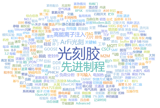 通过全局频次、平均权重、逆向文档频率赋权计算综合得分,以词云图形式可视化各领域关键词的代表性,芯片技术领域的关键词词云图如下: