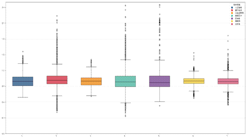 通过对七大领域专利的创新突破指数(InnPower)进行描述性统计,结合箱线图可视化,得到各领域的创新突破特征,各领域的描述性统计结果显示出显著的差异化,对应的箱线图如下: