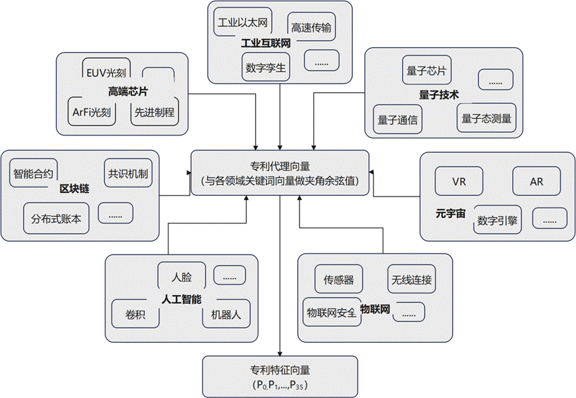 基于代理向量与关键词向量计算余弦相似度,最终得到35维专利特征向量的流程如下:
