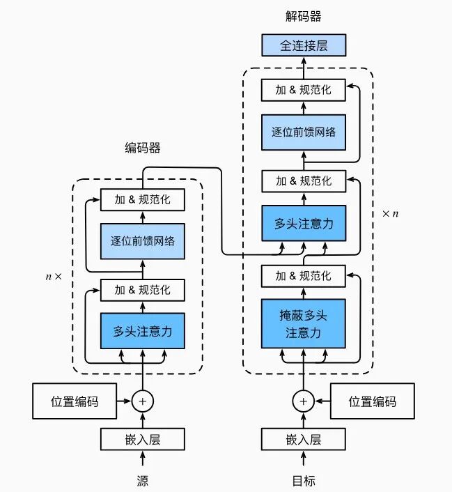 在Transformer架构中,自注意力机制被广泛应用于编码器和解码器中。编码器通过多层自注意力机制和前馈网络,逐步提取序列中的信息,而解码器则利用自注意力机制和编码器-解码器注意力机制生成目标序列。