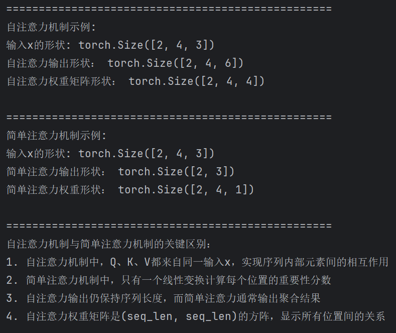 print("3. 自注意力输出仍保持序列长度,而简单注意力通常输出聚合结果")