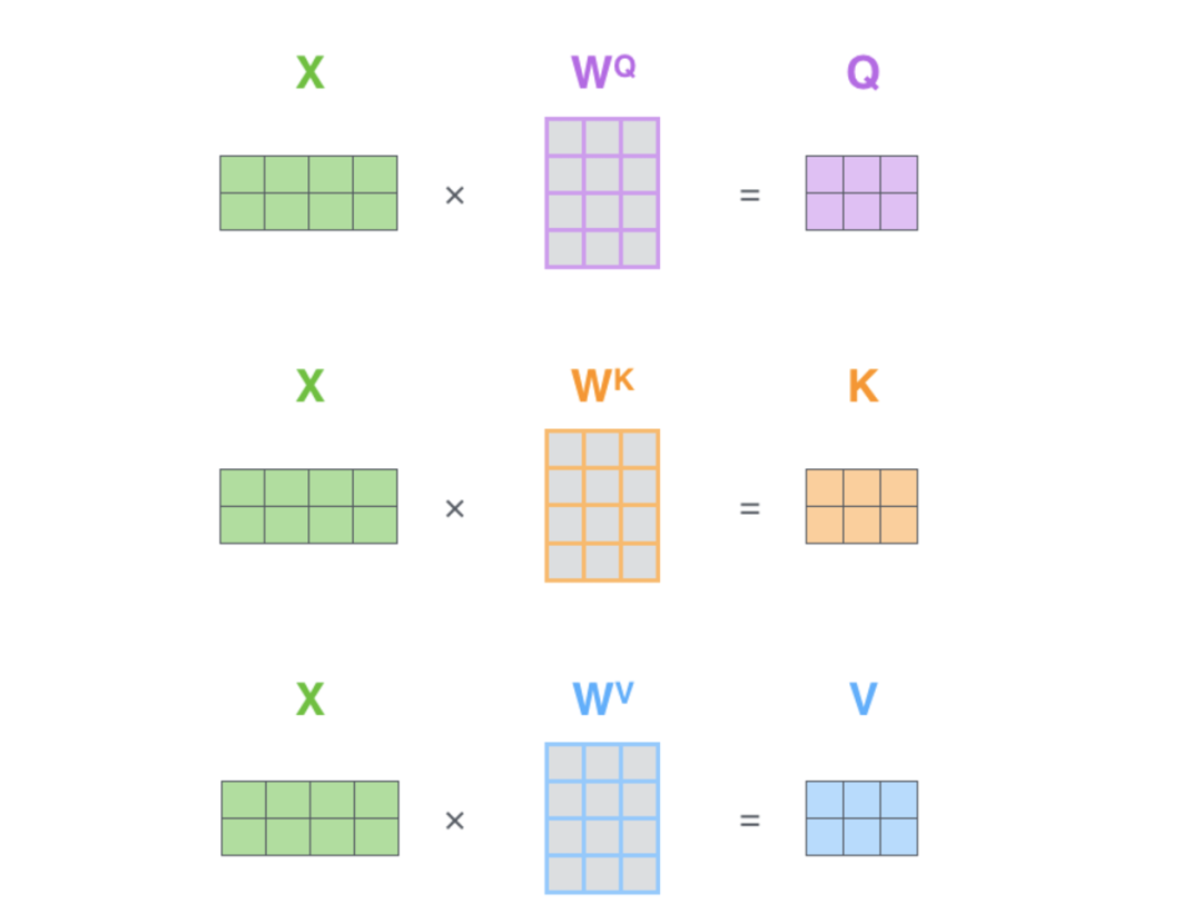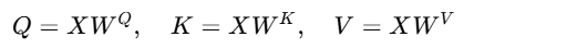 这三个变换可以看作是对原始输入的一种重新编码,目的是从不同角度提取信息,以便后续计算注意力分数时能够更有效地捕捉到元素间的相关性。