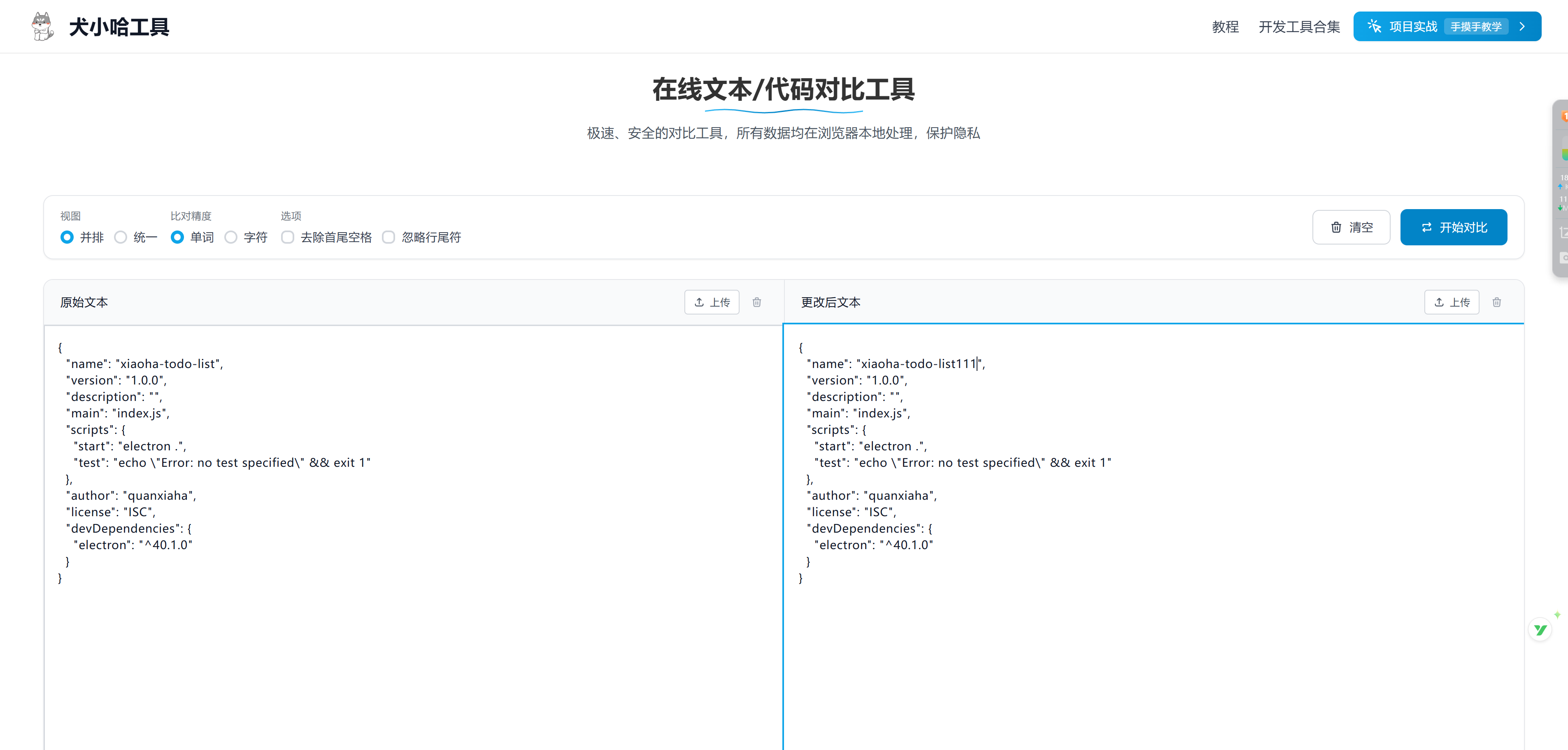 今天,我就要给你安利一个我私藏已久的效率神器——「在线文本对比工具」,网站地址:https://www.quanxiaoha.com/tools/text-compare。