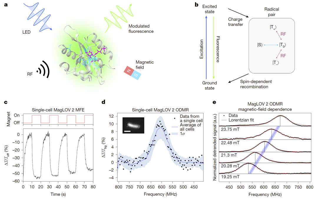 研究人员在表达MagLOV的细菌细胞中观察到明显磁场效应(MFE)与ODMR信号: