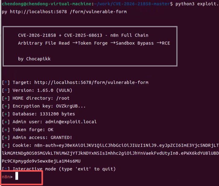 本文复现了CVE-2026-21858和CVE-2025-68613漏洞链,展示了如何从未授权任意文件读取开始,进而伪造管理员令牌,最终通过表达式注入绕过沙箱实现远程命令执行的完整攻击过程。