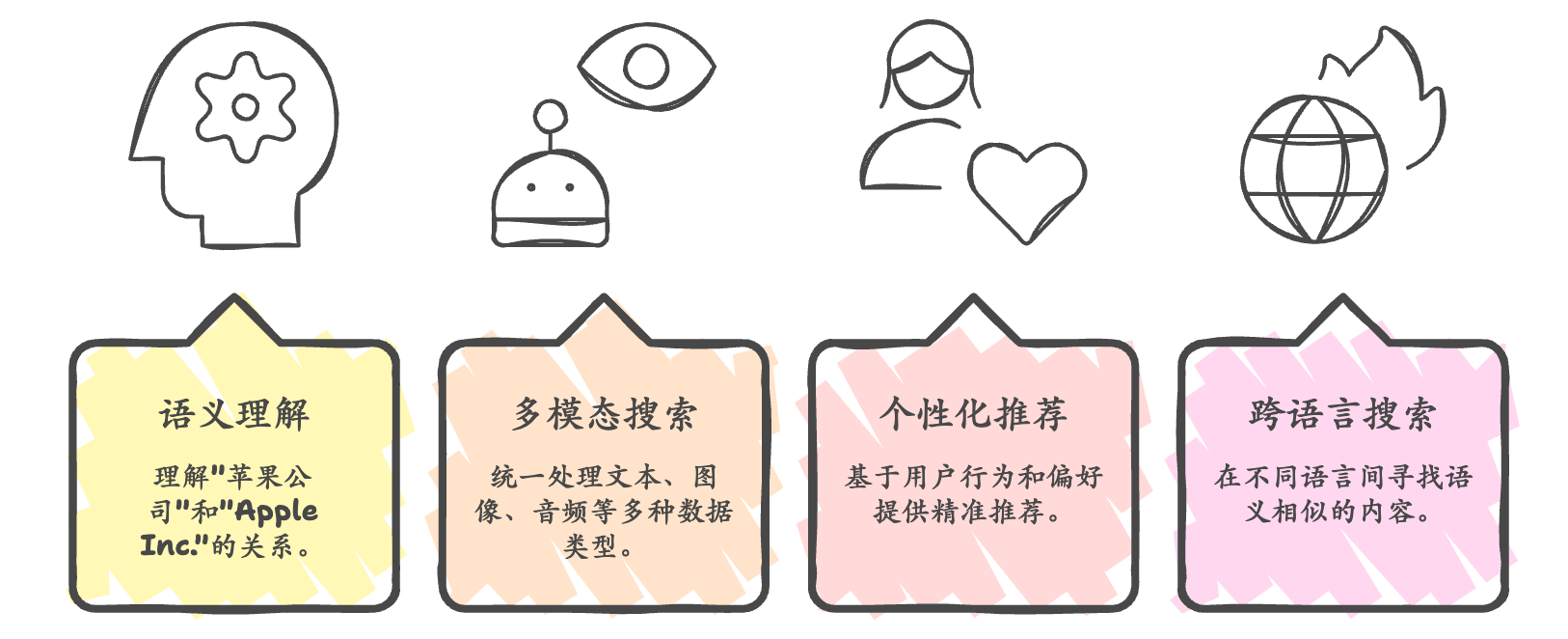 传统关键词搜索(BM25算法)擅长处理精确匹配,比如产品型号、专业术语、人名地名等具体信息。当用户查询"iPhone 15 Pro Max的电池容量"时,关键词搜索能准确找到包含这些具体词语的文档。但这种方法的局限在于无法理解语义关系——它不知道"苹果手机"和"iPhone"是同一概念,也不知道"续航能力"和"电池容量"的关联。
