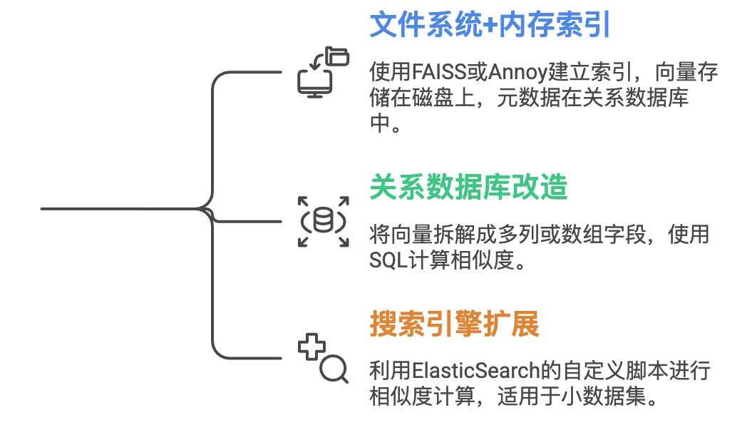 1)文件系统+内存索引:使用FAISS、Annoy等库建立索引,向量以NumPy数组或HDF5文件格式存储在磁盘,元数据放在MySQL/PostgreSQL中,导致数据割裂。