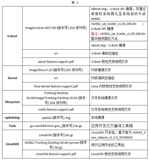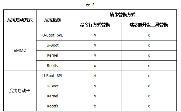 (2)Linux系统各镜像可通过命令行方式和瑞芯微开发工具替换,具体如下表所示。