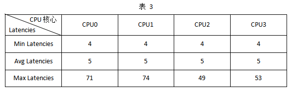 参考如上方法,分析CPU满负荷状态下的统计结果如下所示。本次测试中,CPU2核心Max Latencies值最大,为195us,CPU1核心的Max Latencies值最小,为135us。