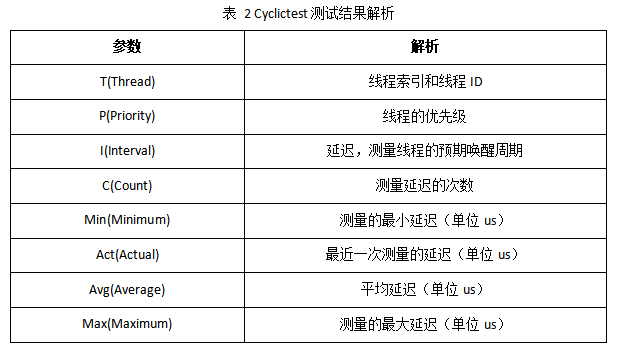 为了测量延迟,Cyclictest运行一个非实时主线程(调度类SCHED_OTHER),该线程以定义的实时优先级(调度类SCHED_FIFO)启动定义数量的测量线程。测量线程周期性地被一个到期的计时器(循环报警)所定义的间隔唤醒,随后计算有效唤醒时间,并通过共享内存将其传递给主线程。主线程统计延迟值并打印最小、最大和平均延迟时间。