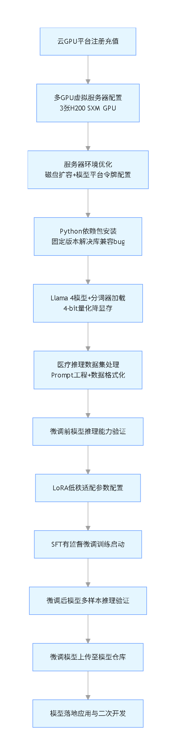本文内容改编自过往客户咨询项目的技术沉淀并且已通过实际业务校验,该项目完整代码与数据已分享至交流社群。阅读原文进群,可与800+行业人士交流成长;还提供人工答疑,拆解核心原理、代码逻辑与业务适配思路,帮大家既懂 怎么做,也懂 为什么这么做;遇代码运行问题,更能享24小时调试支持。 本次Llama 4微调项目的整体实施流程如下(竖版流程图):