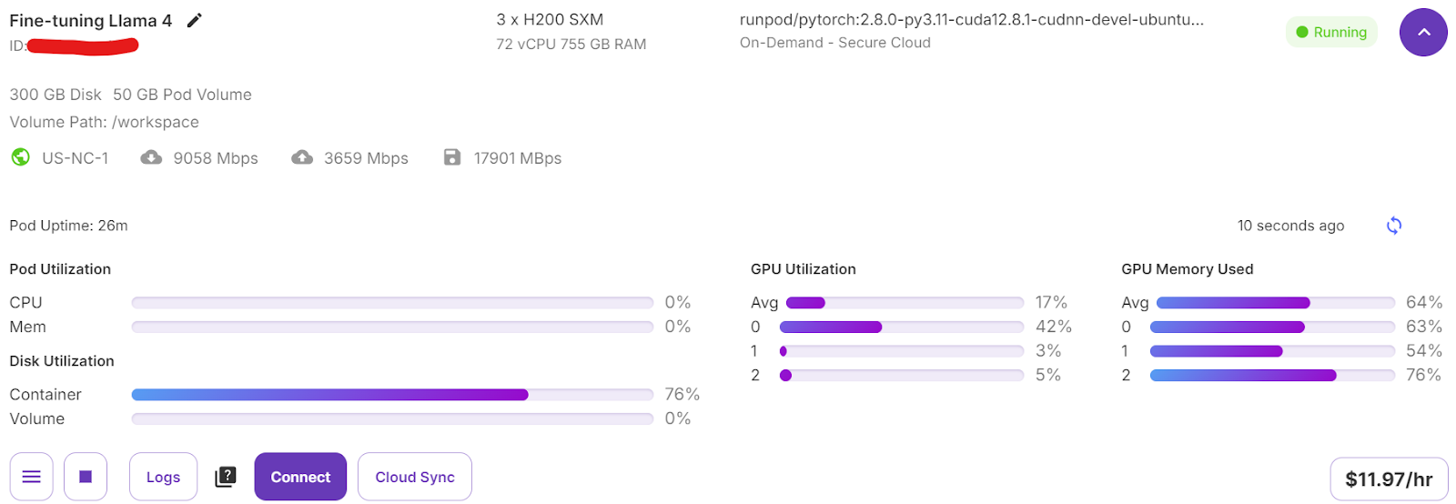 from trl import SFTTrainerfrom transformers import TrainingArguments# 配置SFT训练核心参数,修改所有变量名train_config = TrainingArguments( output_dir="llama4_med_infer_output", # 训练结果输出目录 per_device_train_batch_size=1, # 单设备训练批次大小 per_device_eval_batch_size=1, # 单设备验证批次大小 gradient_accumulation_steps=2, # 梯度累积步数 optim="paged_adamw_32bit", # 训练优化器 ...... # 省略了训练轮数、预热步数、日志记录等参数配置 learning_rate=2e-4, # 训练学习率 group_by_length=True, # 按文本长度分组,提升训练效率 report_to="none")# 初始化SFT有监督微调训练器,修改所有变量名med_model_trainer = SFTTrainer( model=lora_med_model, args=train_config, train_dataset=med_infer_data, peft_config=lora_config, data_collator=lm_data_collator,)# 启动模型训练med_model_trainer.train()启动训练后,可在RunPod平台的虚拟服务器仪表盘查看3张GPU的算力与显存使用情况,仪表盘显示所有GPU均处于高负载状态,说明多GPU的算力资源得到了充分利用,分布式训练配置生效。