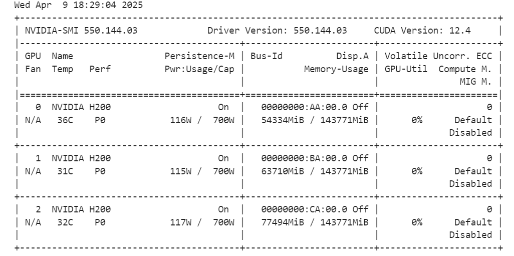 执行nvidia-smi命令后,JupyterLab会输出3张H200 GPU的显存总容量、已占用显存、剩余显存、算力使用率等详细信息,本次项目中模型4-bit量化加载后,各GPU仍有充足的剩余显存,完全能够支撑后续的模型训练工作。