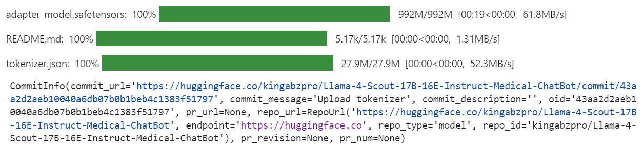 # 上传微调后的医疗推理模型与分词器,修改仓库名称lora_med_model.push_to_hub("Llama-4-Scout-17B-16E-Instruct-Medical-ChatBot")text_tokenizer.push_to_hub("Llama-4-Scout-17B-16E-Instruct-Medical-ChatBot")执行上述代码后,JupyterLab会实时输出模型与分词器的上传进度、文件上传状态、仓库链接等信息,上传完成后可通过该链接直接访问模型仓库,查看模型详情、下载模型文件或直接调用模型开展推理工作。