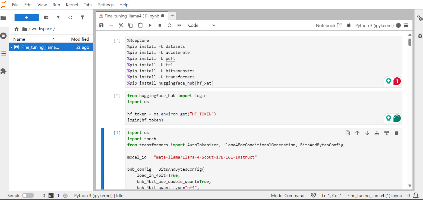 成功进入JupyterLab实例后,在界面中新建Python笔记本,即可开始搭建模型微调的代码环境,后续所有的技术实现步骤,包括依赖包安装、模型量化加载、数据集处理、LoRA配置、SFT训练等,均在该笔记本中完成,云端环境与本地开发的操作体验无差异。