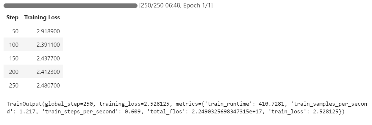 本次项目中,得益于4-bit量化与LoRA低秩适配的技术优化,模型的实际训练时间仅为7分钟,从云环境搭建到模型训练完成的总耗时仅为30分钟,大幅提升了大模型在垂直领域的微调效率;训练过程中,JupyterLab会实时输出训练步数、损失值、训练耗时等关键信息,可直观监控模型的训练状态。