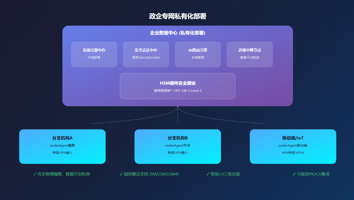 政企专网私有化部署企业数据中心 (私有化部署)设备注册中心本地部署安全认证中心国密SM2/SM3/SM4AI路由引擎本地推理边缘中继节点数据不出机房HSM硬件安全模块根密钥保护 · FIPS 140-2 Level 3分支机构AooderAgent集群专线/VPN接入分支机构BooderAgent节点专线/VPN接入移动端/IoTooderAgent移动端APN专线/VPDN✓ 完全物理隔离,数据不出机房✓ 国密算法支持 (SM2/SM3/SM4)✓ 等保2.0三级合规✓ 与现有PKI/CA集成
