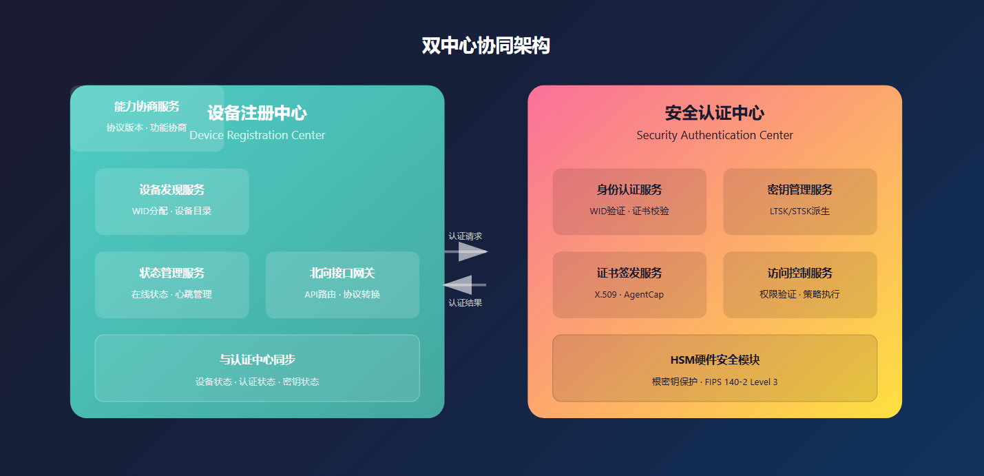 双中心协同架构设备注册中心Device Registration Center设备发现服务WID分配 · 设备目录能力协商服务协议版本 · 功能协商状态管理服务在线状态 · 心跳管理北向接口网关API路由 · 协议转换与认证中心同步设备状态 · 认证状态 · 密钥状态认证请求认证结果安全认证中心Security Authentication Center身份认证服务WID验证 · 证书校验密钥管理服务LTSK/STSK派生证书签发服务X.509 · AgentCap访问控制服务权限验证 · 策略执行HSM硬件安全模块根密钥保护 · FIPS 140-2 Level 3