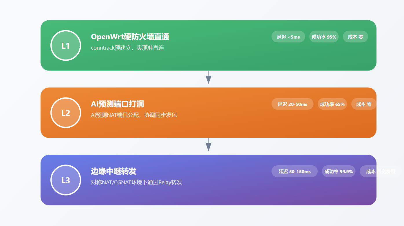 L1OpenWrt硬防火墙直通conntrack预建立,实现准直连延迟 <5ms成功率 95%成本 零L2AI预测端口打洞AI预测NAT端口分配,协调同步发包延迟 20-50ms成功率 65%成本 零L3边缘中继转发对称NAT/CGNAT环境下通过Relay转发延迟 50-150ms成功率 99.9%成本 带宽费用