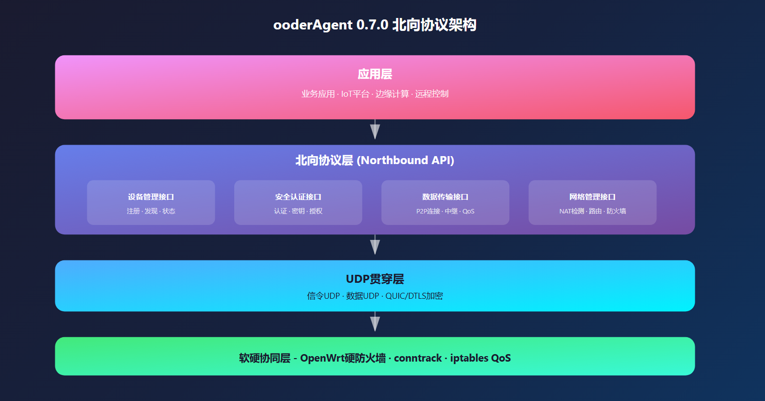 ooderAgent 0.7.0 北向协议架构应用层业务应用 · IoT平台 · 边缘计算 · 远程控制北向协议层 (Northbound API)设备管理接口注册 · 发现 · 状态安全认证接口认证 · 密钥 · 授权数据传输接口P2P连接 · 中继 · QoS网络管理接口NAT检测 · 路由 · 防火墙UDP贯穿层信令UDP · 数据UDP · QUIC/DTLS加密软硬协同层 - OpenWrt硬防火墙 · conntrack · iptables QoS