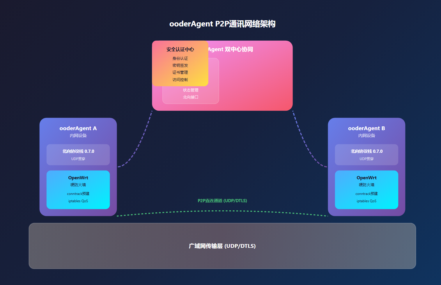 ooderAgent P2P通讯网络架构广域网传输层 (UDP/DTLS)ooderAgent 双中心协同设备注册中心设备发现能力协商状态管理北向接口安全认证中心身份认证密钥签发证书管理访问控制ooderAgent A内网设备北向协议栈 0.7.0UDP贯穿OpenWrt硬防火墙conntrack预建iptables QoSooderAgent B内网设备北向协议栈 0.7.0UDP贯穿OpenWrt硬防火墙conntrack预建iptables QoSP2P直连通道 (UDP/DTLS)