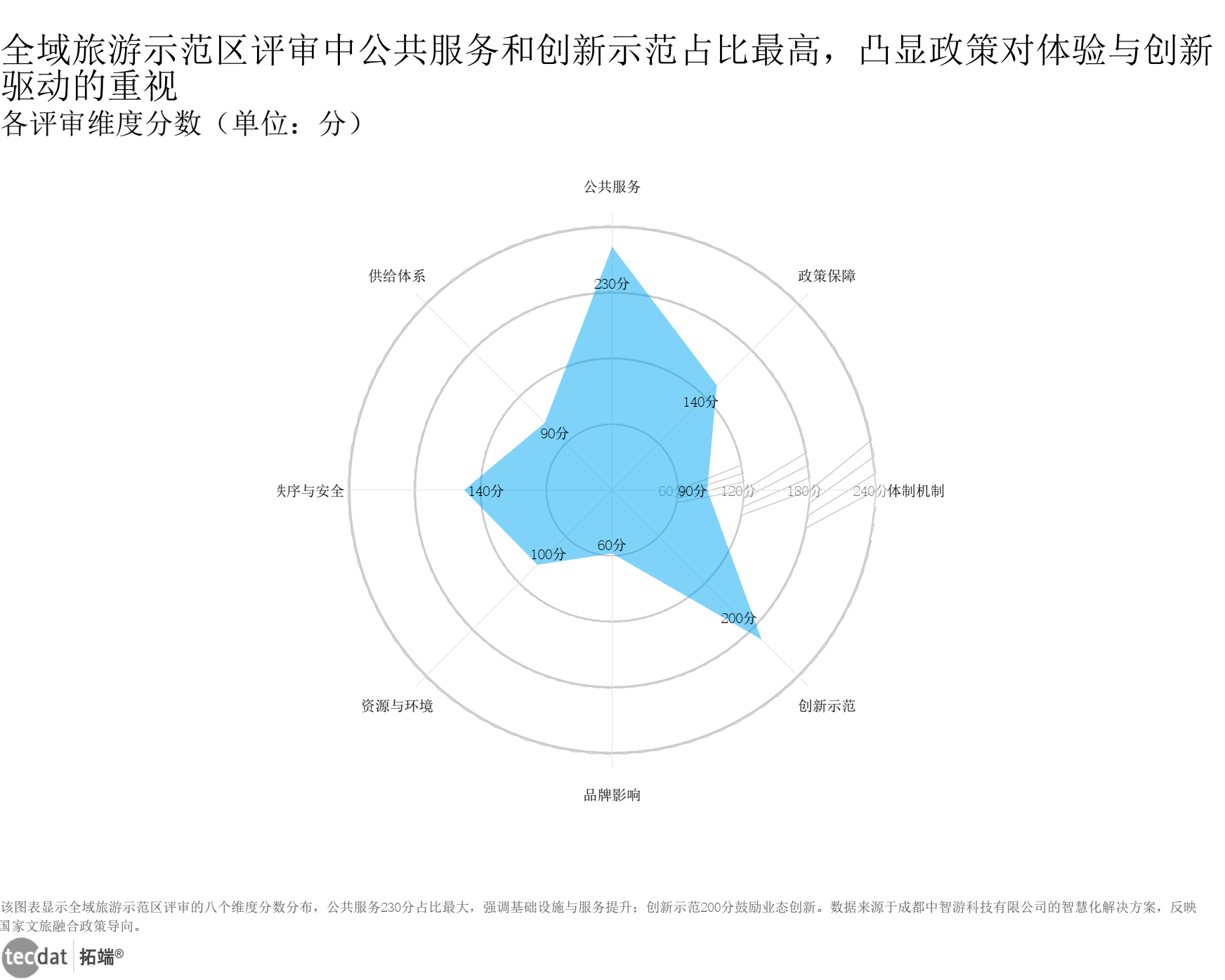 成本节约横向比例条形图表8数据EXCEL及图表PDF模板已分享到会员群 3秒解读:集中采购+AI工具+预算管控,构成差旅成本控制的“铁三角”,缺一不可。 对应人群行动建议:中小企业可优先加入TMC集采平台享受AI议价红利,大型企业可构建“AI预算+AI采购”双系统。 在目的地运营层面,政策引导下的智慧化建设成为行业发展的核心方向,全域旅游示范区评审标准明确了AI技术的落地重点,让智慧化建设有标可循。全域旅游示范区评审设置了体制机制、政策保障、公共服务、供给体系等八个维度,其中公共服务占230分、创新示范占200分,位列前两位,政策导向清晰推动目的地加速AI技术落地,从智能导览、客流监测到应急调度,AI成为提升目的地评审分数、增强核心竞争力的核心抓手。
