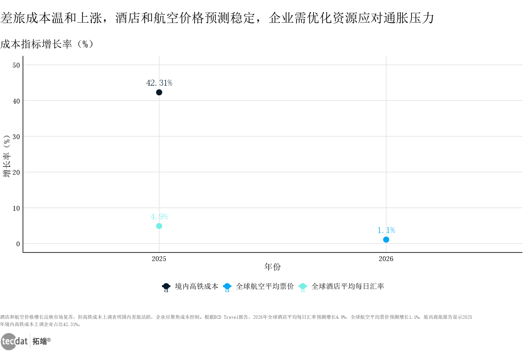 差旅各环节成本的温和上涨,让文旅企业的成本管控压力持续增加,传统“一刀切”的成本控制方式已失效,AI的精准化、精细化管理能力成为行业的核心选择。2026年全球酒店平均每日房价预测增长4.9%,全球航空平均票价增长1.1%,国际差旅成本呈现温和上涨态势;而2025年境内高铁成本上调企业占比达42.31%,境内差旅的成本压力更为突出,境内外成本变化的差异化特征,要求AI工具具备分场景、精准化的优化能力。