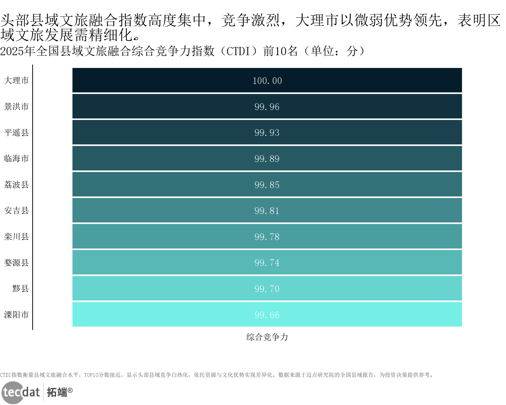 智慧化评审标准雷达图表9数据EXCEL及图表PDF模板已分享到会员群 3秒解读:政策引导下,目的地智慧化建设聚焦“公共服务”与“创新示范”,AI是核心落地技术。 对应人群行动建议:目的地管理者可按评审维度,优先部署AI导览、客流监测等高频应用;文旅企业可对接目的地智慧平台,获取精准流量。 县域文旅市场成为文旅产业发展的重要赛道,头部县域的竞争呈现白热化特征,传统资源优势已难以形成壁垒,AI驱动的运营效率成为核心竞争力。2025年全国县域文旅融合综合竞争力指数(CTDI)前10名分数高度集中,大理市以100.00分位列第一,景洪市99.96分、平遥县99.93分紧随其后,头部县域的差距不足0.1分,而AI在内容创作、客流调控、产品创新中的应用,成为县域文旅拉开竞争差距的核心要素。