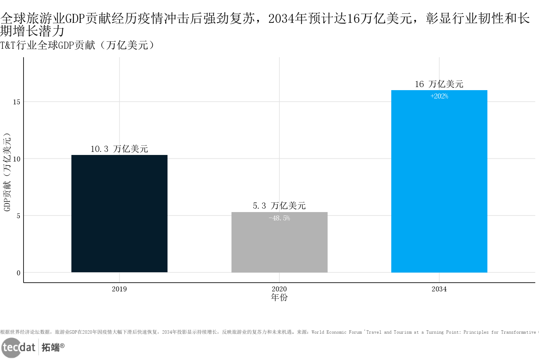 旅游GDP增长预测 | 世界经济论坛《Travel and Tourism at a Turning Point》 | 2034年全球旅游GDP将达16万亿美元 | 无直接数据差异 | 统计口径一致:均为全球旅游文旅行业直接+间接GDP贡献 |